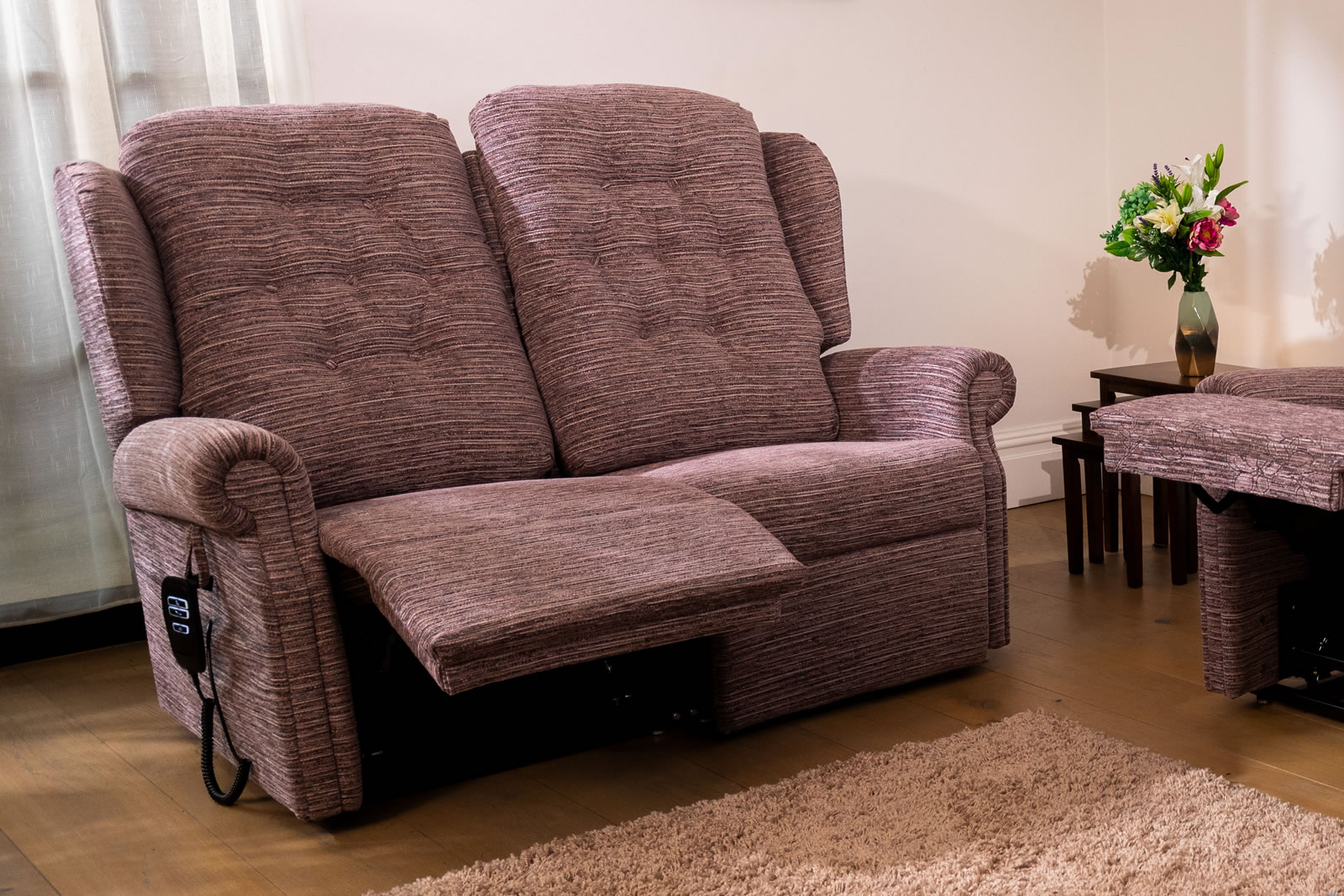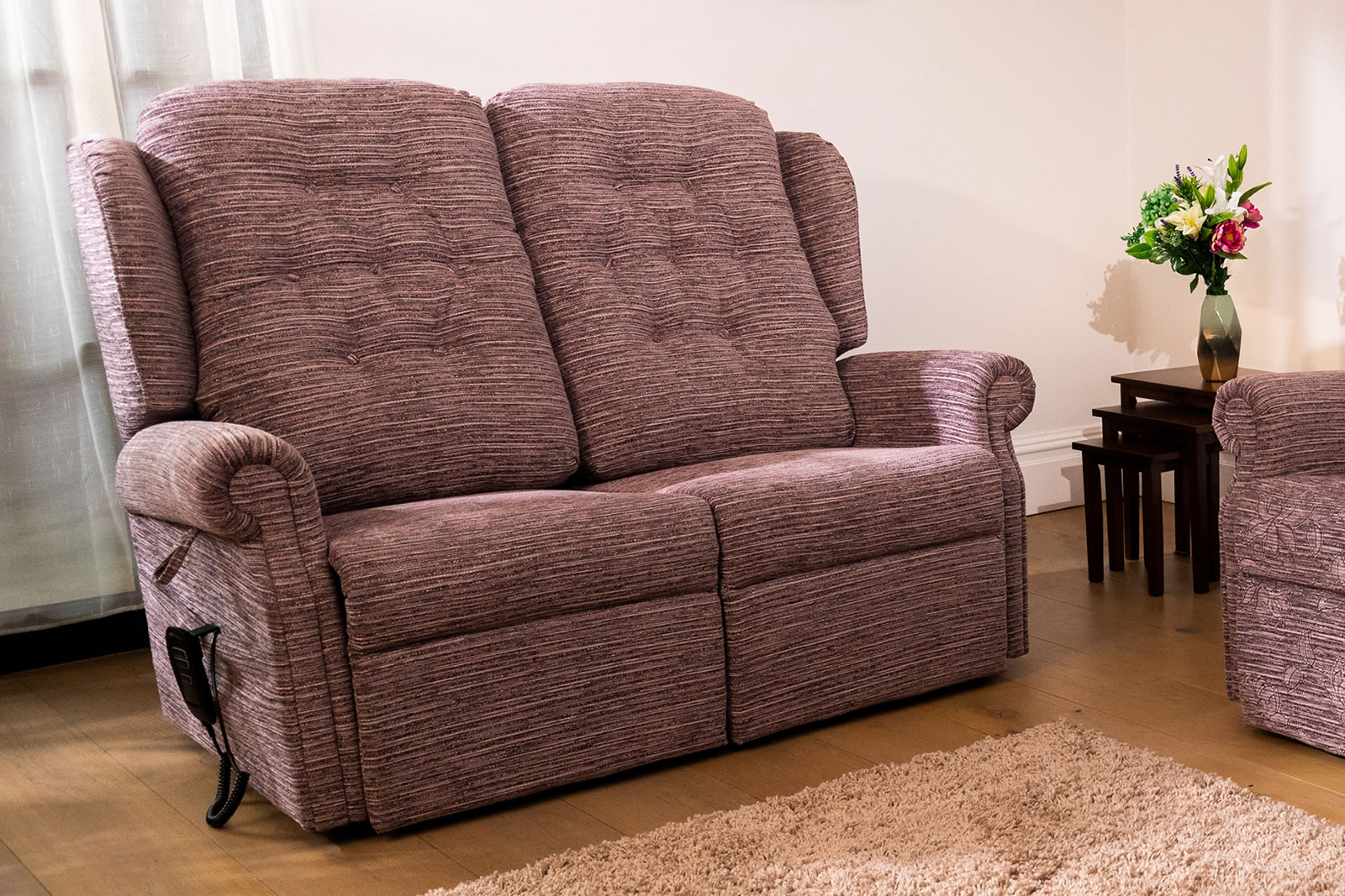Our two seater recliner sofas are designed with independence and comfort in mind. Each set can raise and lower individually, helping those with mobility issues stand up and sit down with ease. Simple, smooth reclining functions and adjustable leg support let you find the perfect position to relax- whether that’s sitting upright with a brew or reclining back to relax.